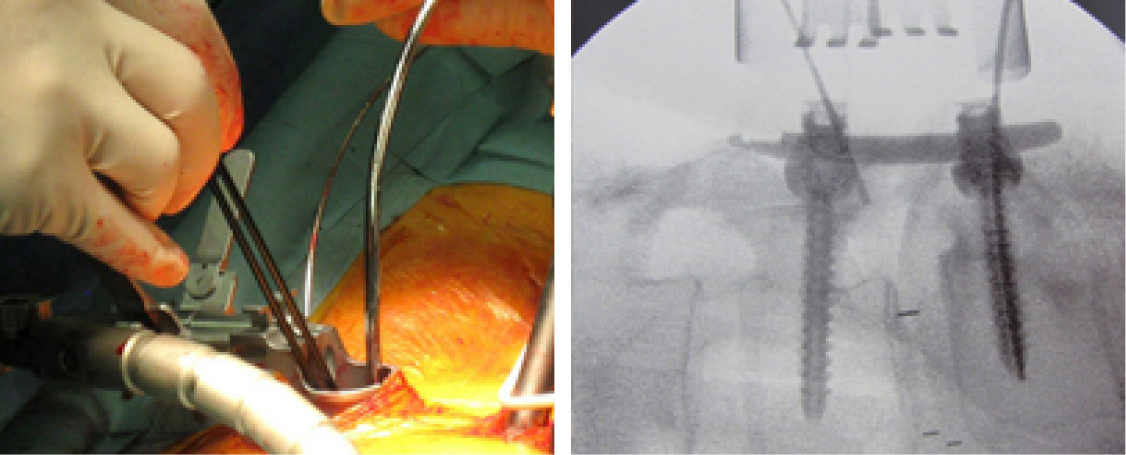 【左】特殊な開窓器を行い、筋肉をいためず除圧、固定、骨移植を行う。【右】レントゲン透視撮影を行いながら安全にスクリュー刺入や椎体間固定を行う。