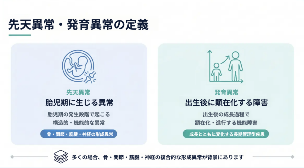 同じように見える症状でも、胎児期の発生段階で生じた構造的な異常なのか、出生後の成長過程で顕在化・進行する機能障害なのかによって、評価の視点や今後の見通しは大きく異なります。