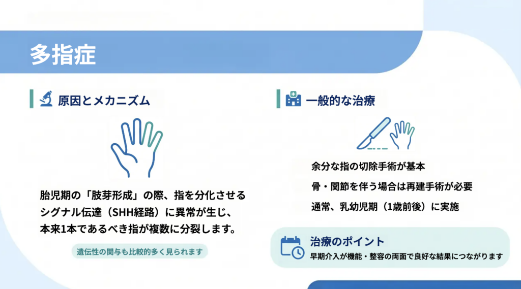 そのため、多指症では見た目の違いだけでなく、機能面と成長への影響を含めて考えることが重要です。
