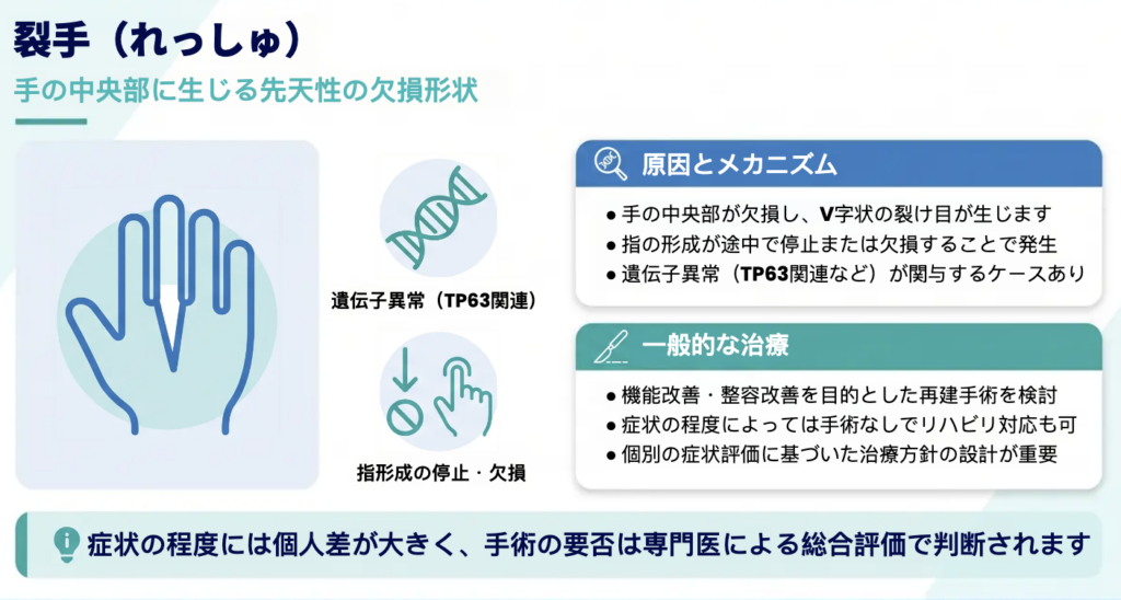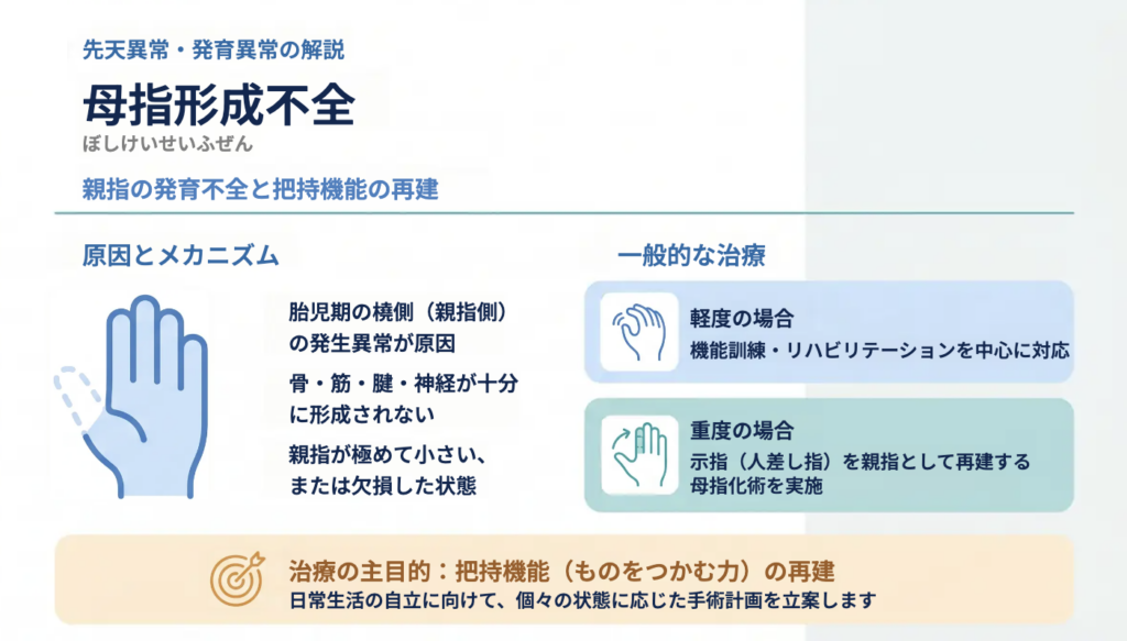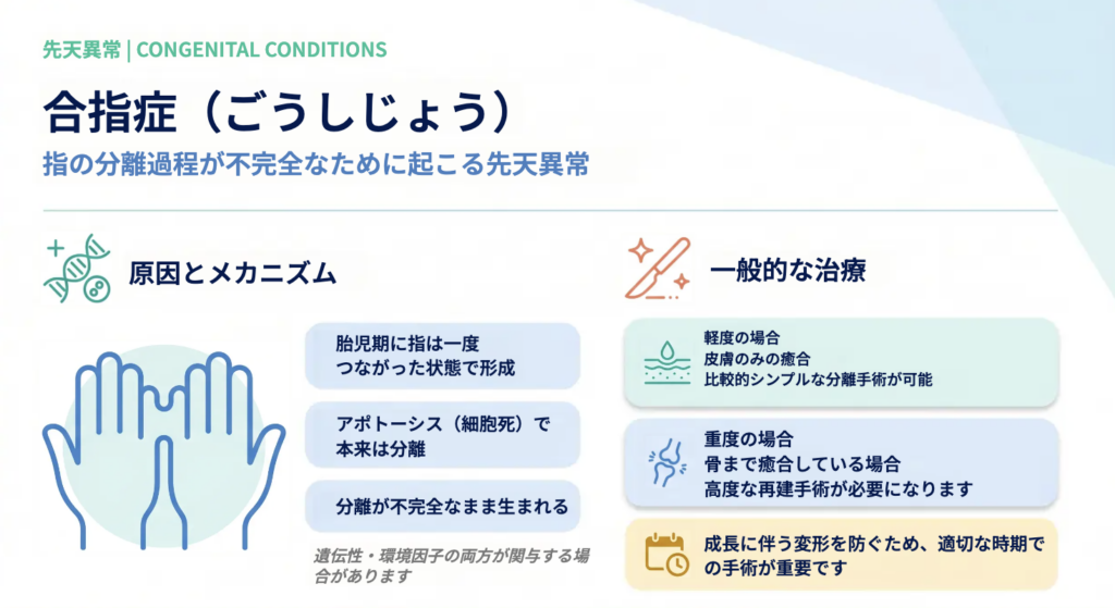 本記事では、以下の代表的な先天異常・発育異常について、原因・メカニズム・一般的な治療を手外科視点で丁寧に解説します。