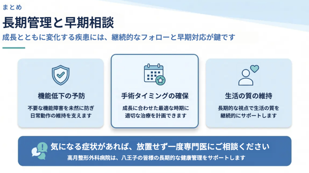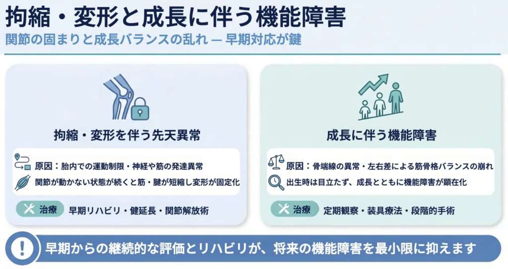 拘縮・変形および成長に伴う機能障害に共通して重要なのは、早期からの継続的な評価と適切なタイミングでの介入です。