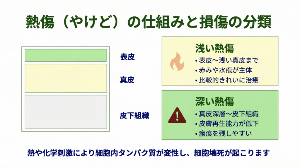 熱傷は、熱湯・油・火炎などの高温刺激だけでなく、酸やアルカリなどの化学刺激によっても生じます。これらの刺激が皮膚に加わると、細胞内のタンパク質が変性し、細胞壊死が起こります。