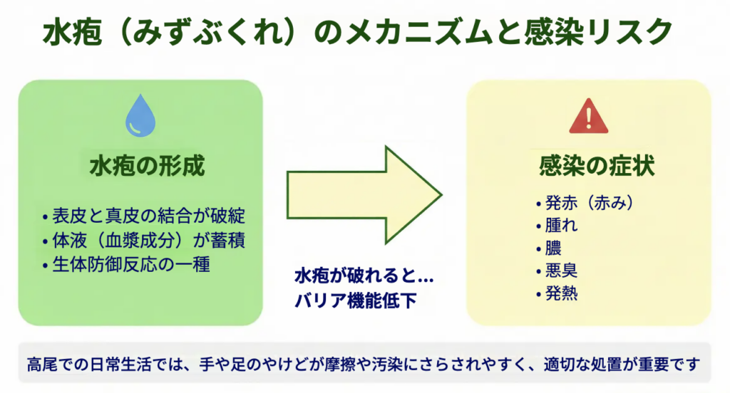 水疱は単なる“水たまり”ではなく、損傷部位を外部刺激から守ろうとする生体防御反応の一つです。水疱の膜が保たれている間は、傷ついた部位が覆われることで乾燥や摩擦が軽減され、細菌が侵入しにくい状態が維持されます。