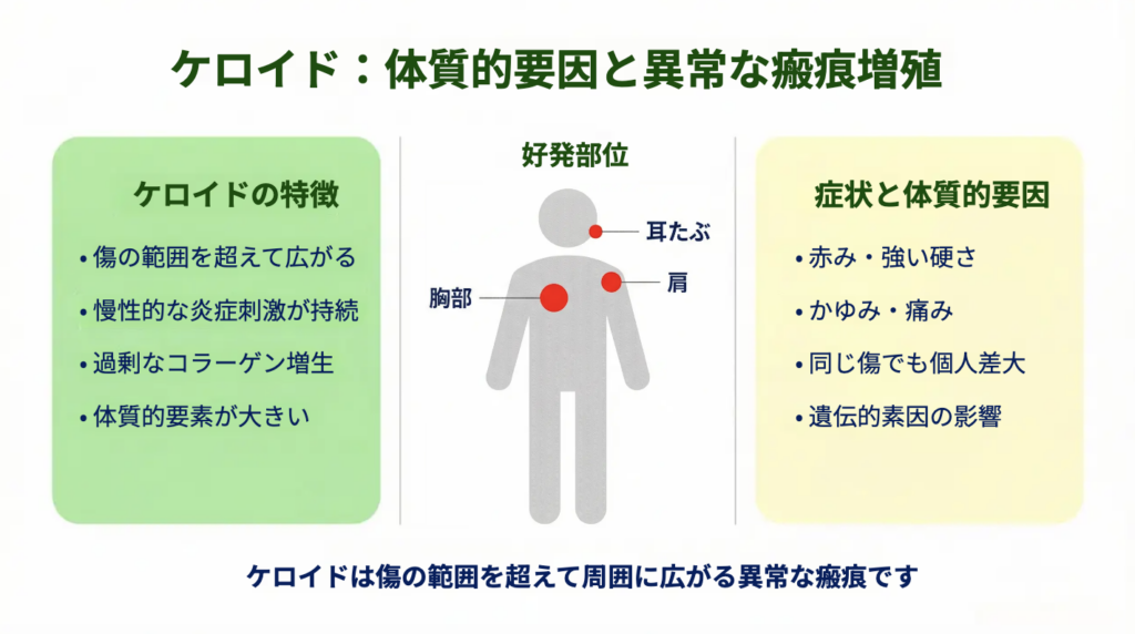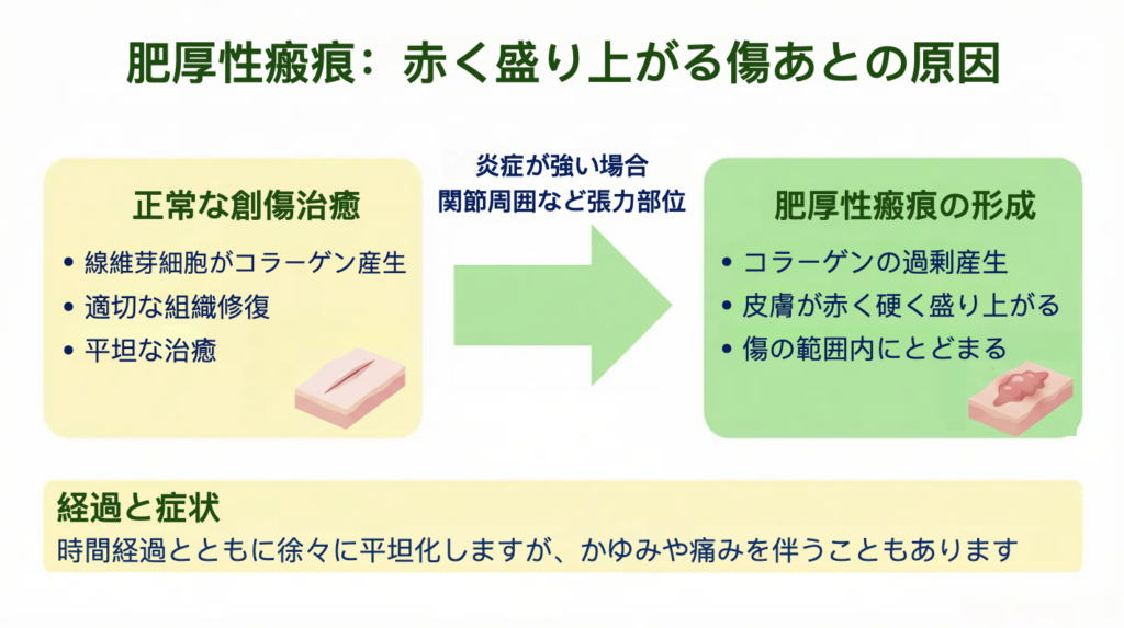 一方で、炎症が強く長引くと、修復反応が過剰になり、コラーゲンが必要以上に作られてしまうことがあります。その結果、皮膚は赤く、硬く、厚みをもって盛り上がっていきます。