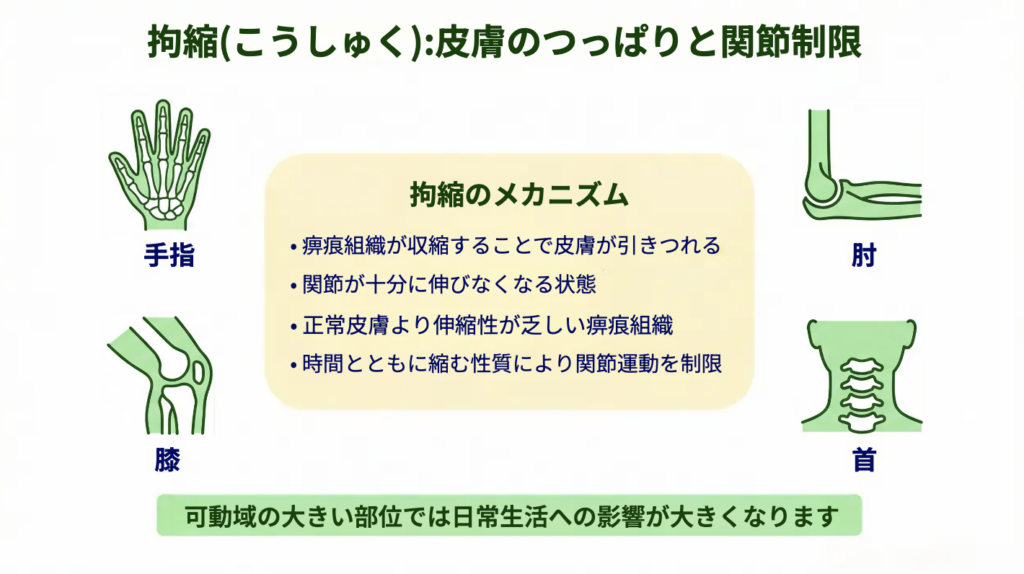 深い熱傷では正常な皮膚構造が失われるため、治癒には時間がかかり、修復過程で瘢痕化が進みやすくなります。関節周囲に生じた場合には、瘢痕が収縮し、拘縮(関節が伸びにくい状態)を引き起こすことがあります。