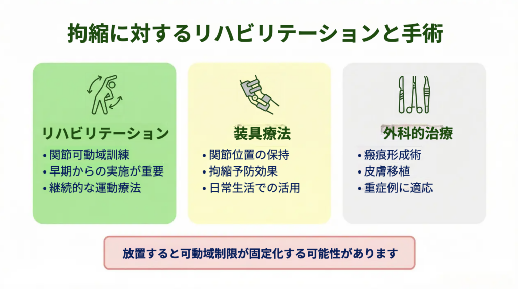 急性期であれば炎症と感染管理を優先し、瘢痕期であればコラーゲンの過剰産生を抑える保存療法やリハビリテーションを中心に検討します。拘縮が進行している場合には、装具療法や外科的治療も視野に入れながら、機能回復を目指します。