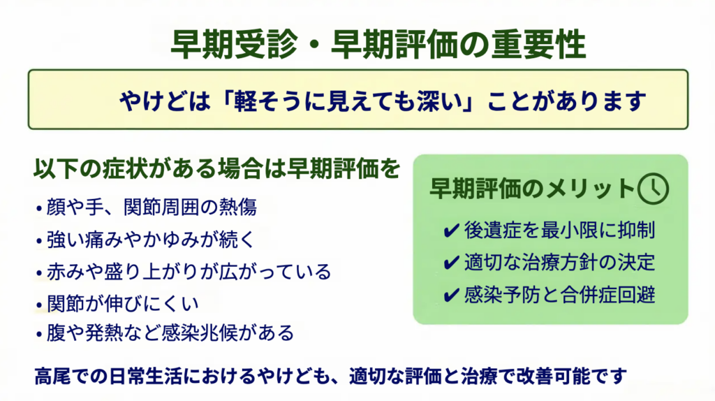 やけどは、受傷直後からの管理と、その後の瘢痕管理の両方が重要です。早い段階で状態を把握することで、保存療法を開始するタイミングを逃さず、必要に応じてリハビリテーションや装具療法を組み合わせることが可能になります。結果として、目立つ傷あとや機能障害のリスクを減らすことにつながります。