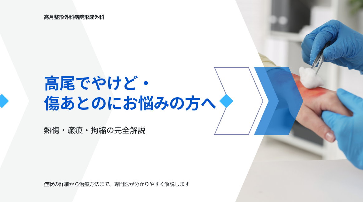 高月整形外科病院の形成外科では、高尾でやけどや傷あとに悩む方に対し、受傷の原因・深さ・範囲・部位を総合的に評価し、早期から適切な対応を行うことを重視しています。早期評価は「今の状態を正しく知る」だけでなく、「将来起こり得る変化を予測する」ことにもつながります。
