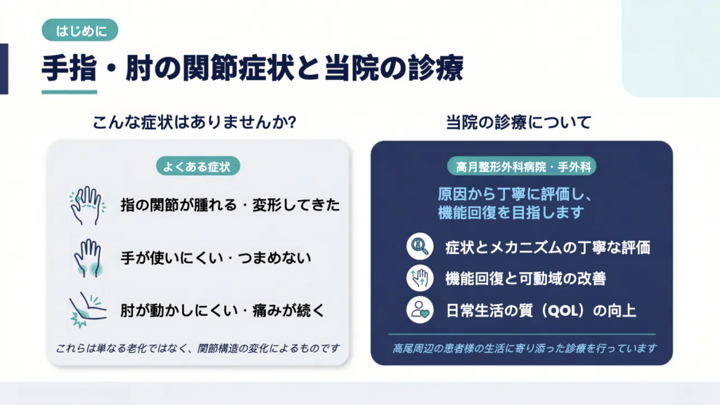 といった利点があります。特に、使うと痛い、以前より動かしにくい、左右差が気になるといった変化は、早めに評価する価値があります。高月整形外科病院・手外科では、こうした初期症状の段階から丁寧に診療を行い、高尾で関節症状に悩まれる方の機能維持と生活の質の向上を目指しています。