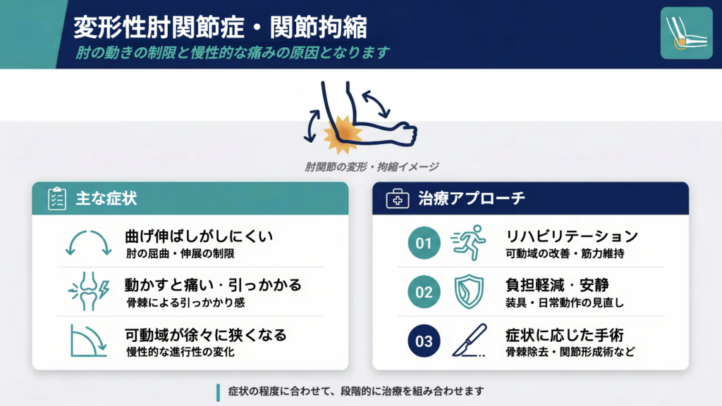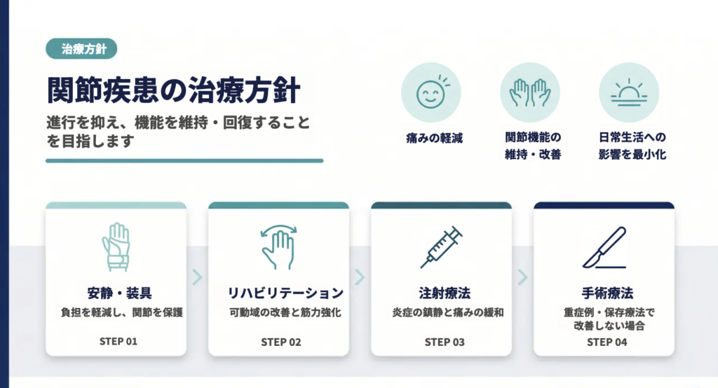 → 重症例や保存療法で改善が得られない場合に検討し、関節機能の改善を目指します。