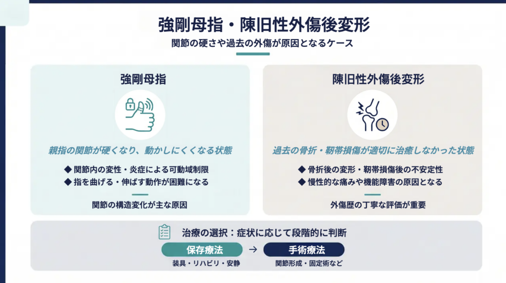 一方で、保存療法だけでは十分な改善が得られない場合や、変形や可動域制限が強く、生活に大きな支障がある場合には、