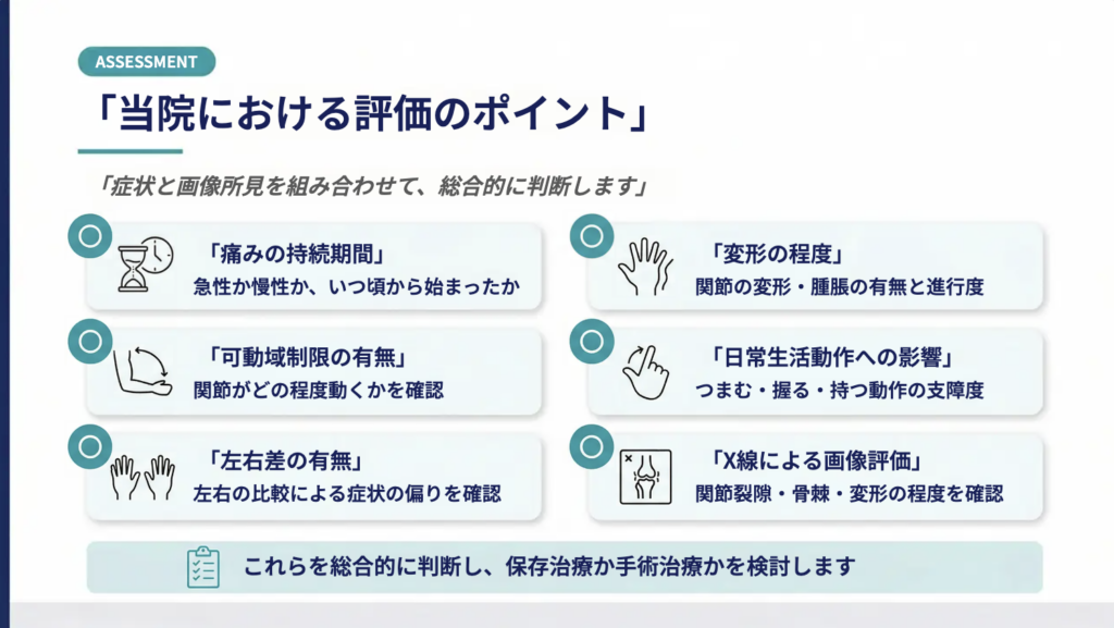 関節の変形や痛みは、適切なタイミングで対応することで進行を抑えることが可能なケースも多く、早期からの治療介入が機能維持につながります。そのため、現在の状態を正確に把握し、無理のない治療方針を立てることが重要です。