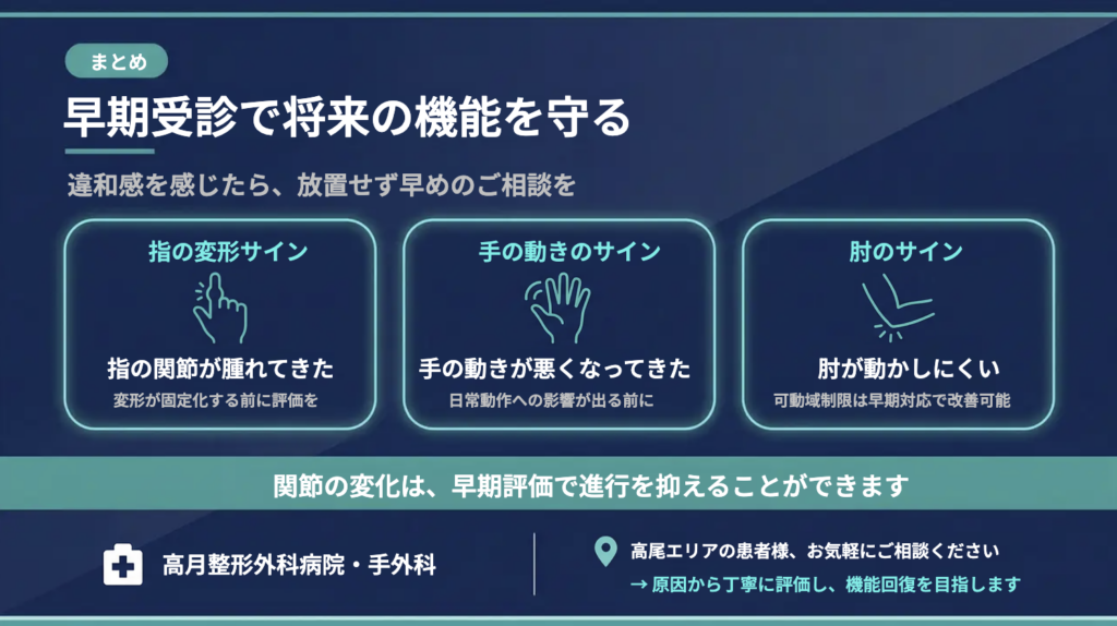 手指や手関節、肘の関節疾患は、痛みや変形がはっきりしてから受診されることも少なくありません。しかし実際には、違和感や軽い動かしにくさの段階で状態を確認することが、将来の機能を守るうえで非常に重要です。関節の変化は、早期に評価することで進行を抑えられる可能性があり、症状が固定化する前に対応することが、結果として日常生活への影響を小さくします。