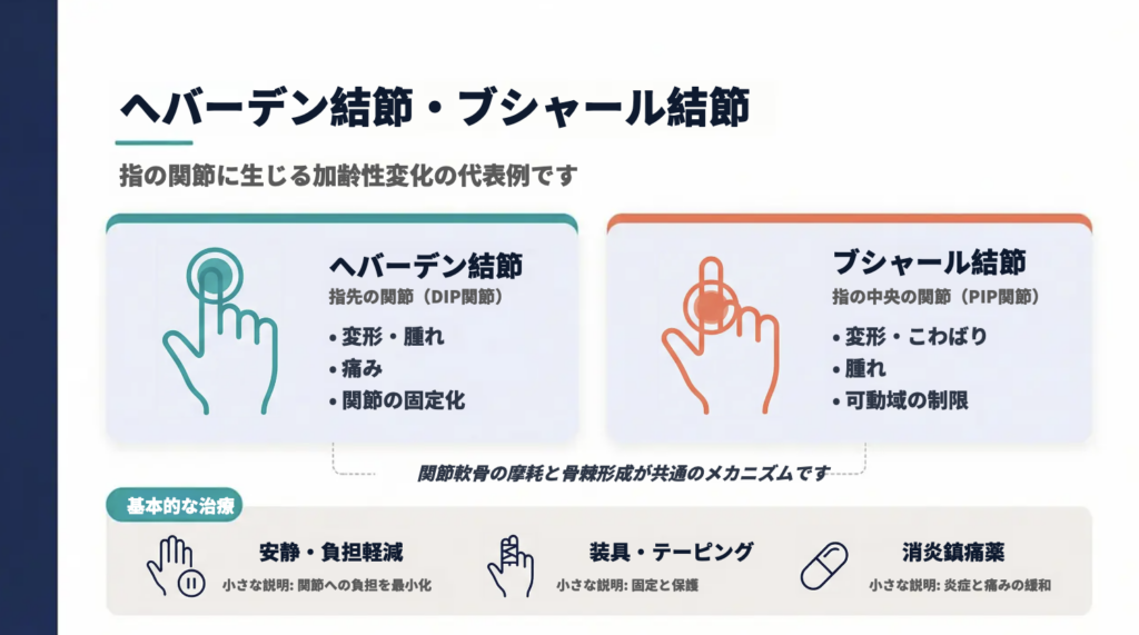 へバーデン結節とブシャール結節は、手指の関節に起こる代表的な変形性関節疾患であり、加齢に伴う変化としてみられることが多い一方、実際には関節軟骨の摩耗や骨棘形成といった構造変化が背景にある病態です。見た目の変形だけでなく、痛みやこわばり、動かしにくさを伴うことがあり、日常生活の細かな動作にも影響を及ぼします。