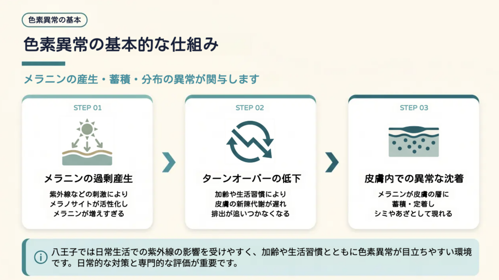 八王子では、日常生活の中で紫外線の影響を受ける機会が多く、加齢や生活習慣とともに色素異常が目立ちやすくなることがあります。