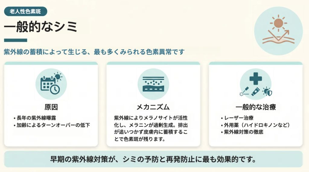 老人性色素斑は、一般的に「シミ」と呼ばれることが多い代表的な色素異常です。