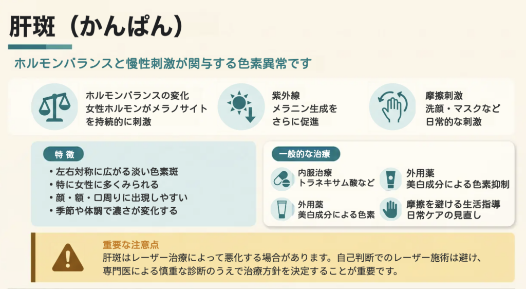 特に肝斑や炎症が残っている状態では、刺激によって色素沈着が悪化することがあるため、慎重な判断が必要です。