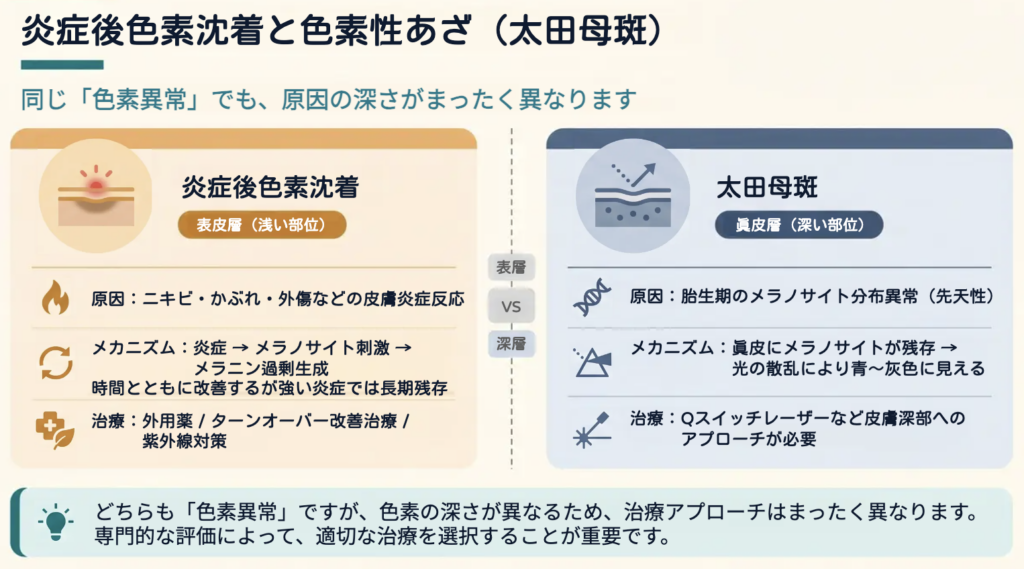 このように、色素の深さや分布によって見え方が変わるため、治療方針も異なります。