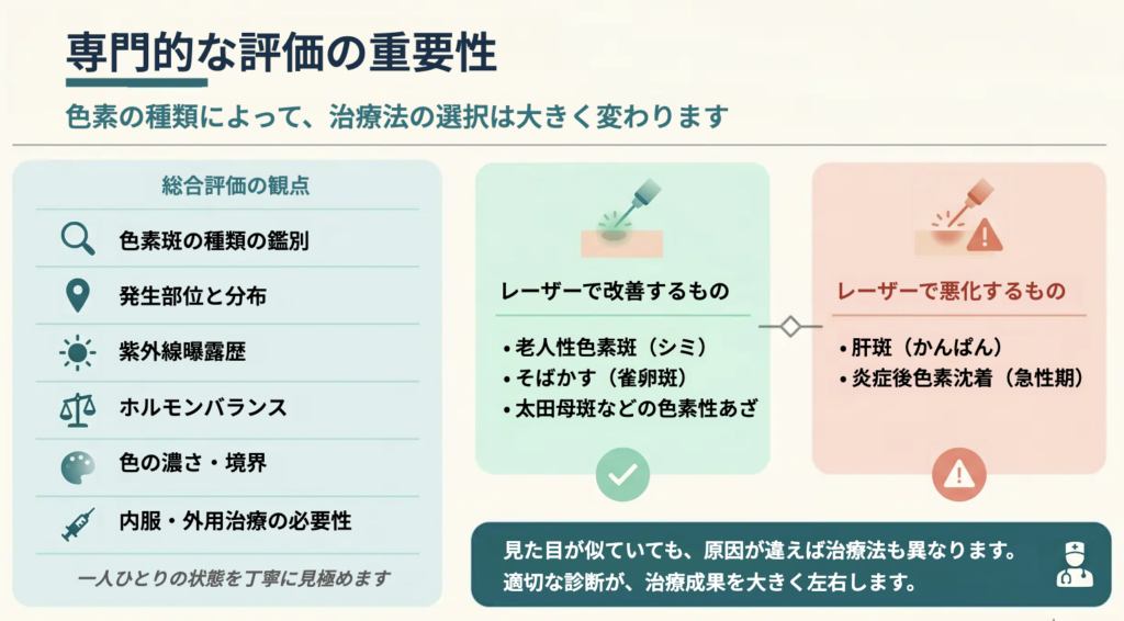 色素異常の治療では、まず「どの種類の色素斑なのか」を見極めることが重要です。