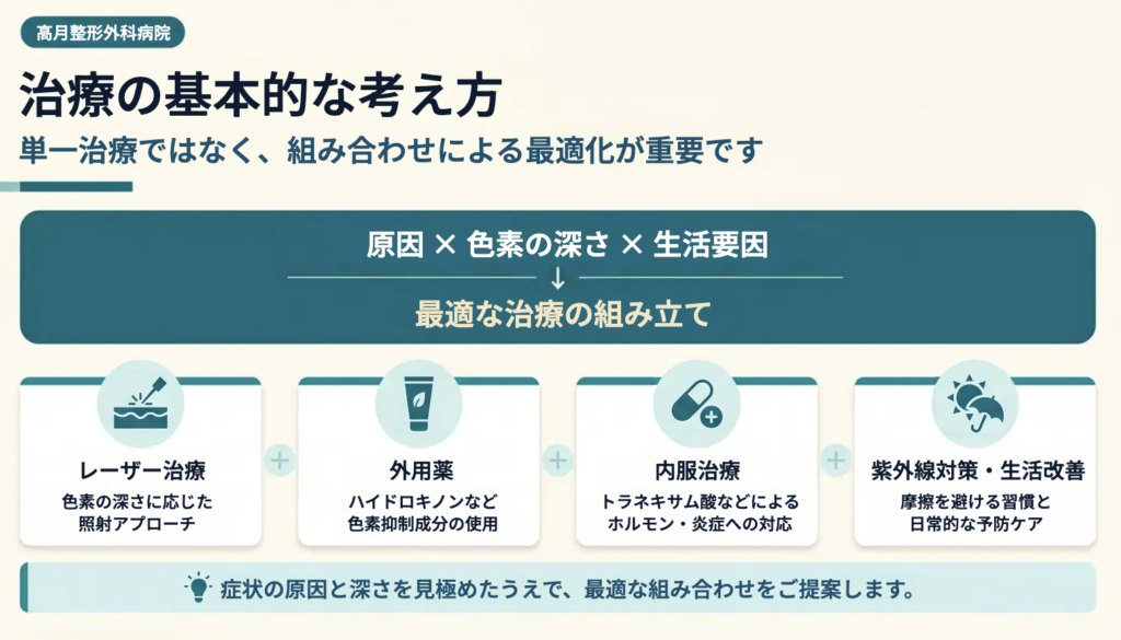 同じシミ・あざ・色素沈着でも、レーザー治療が適している場合もあれば、外用薬や内服治療、生活改善を優先したほうがよい場合もあります。