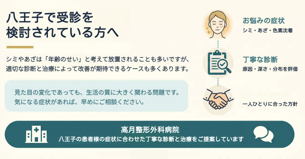 高月整形外科病院の美容外科では、八王子の患者様に対して、色素斑の種類、深さ、分布、生活背景を丁寧に評価し、無理のない治療方針を検討しています。