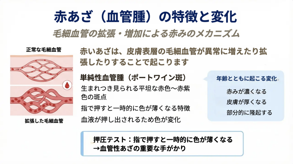 このような背景を理解することで、赤あざが単なる皮膚の色調変化ではなく、「血管の状態の変化」によるものであることが明確になります。