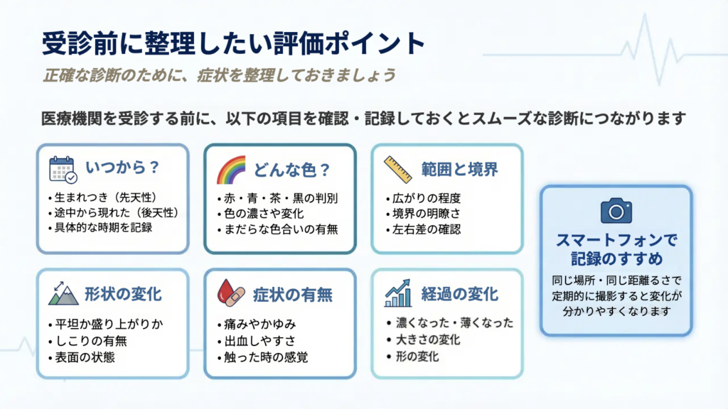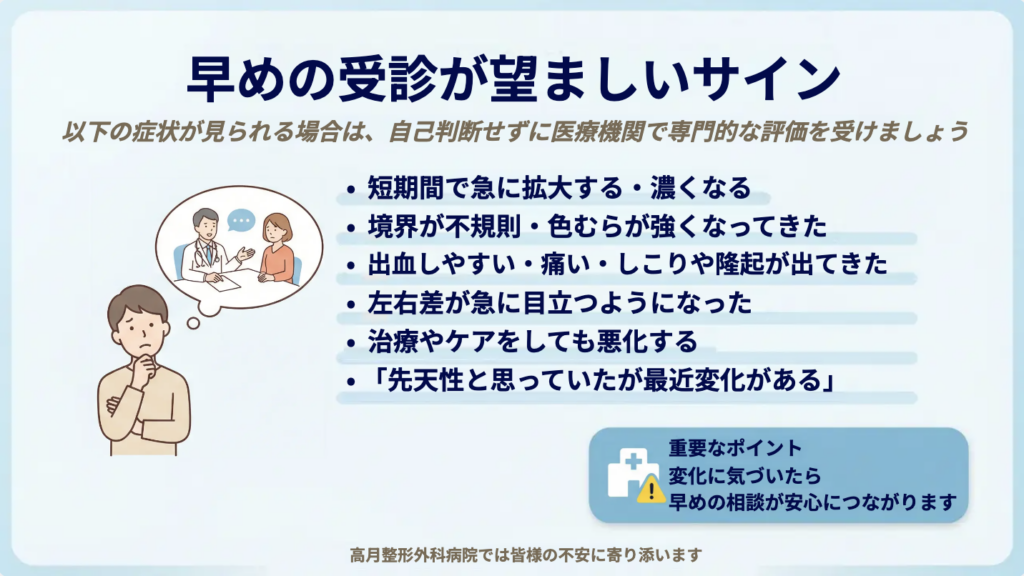 ・急な拡大・隆起・出血・痛みがあれば、早めの受診が望ましい