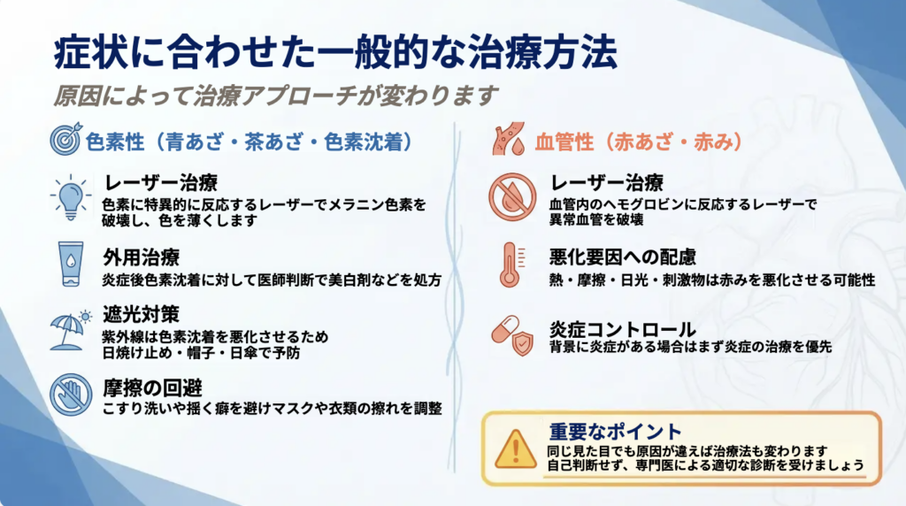同じ「あざ」に見えても、色素性病変なのか、血管性病変なのか、あるいは炎症後の変化なのかによって治療法は異なります。自己判断で対処を続けるよりも、医学的に整理された評価を受けることが、結果的に安心につながります。