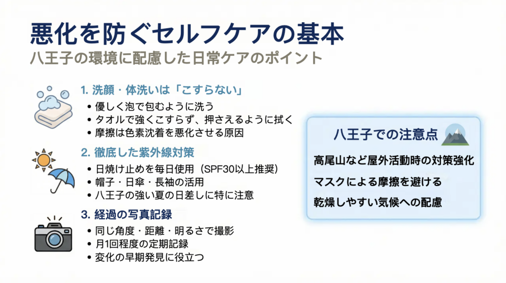 あざや皮膚の色の異常は、適切な治療だけでなく、日常のケアによって経過が大きく左右されます。特に色素性病変ではメラニン色素の増加を防ぐこと、血管性病変では血管拡張を助長する刺激を避けることが重要です。