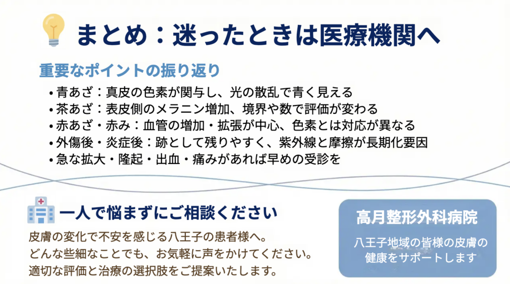 あざや色の異常は、「様子を見てもよいもの」と「早期評価が望ましいもの」があります。その違いを自己判断することは難しいため、少しでも不安を感じた場合には専門医に相談することが大切です。