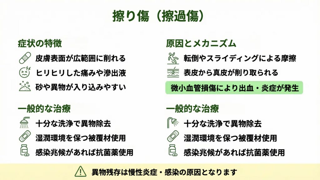 擦過傷は「汚れが入りやすい傷」です。砂やアスファルト片などが残ると、細菌が増えやすい環境になり、治癒が遅れたり、腫れ・痛み・熱感が悪化する原因になります。傷あと(色素沈着・ざらつき)が残りやすくなる点でも、初期の処置が重要です。