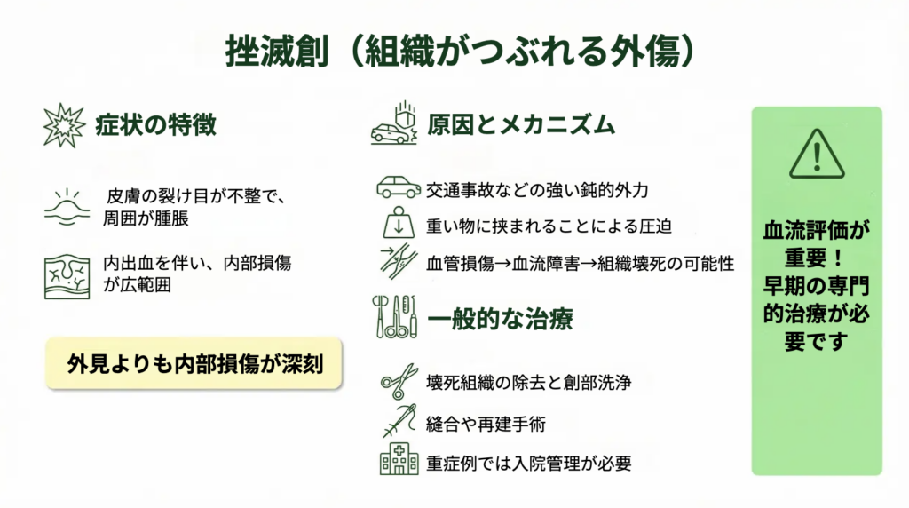 挫滅創や強い打撲、転倒などでは、外見の傷が小さくても内部で広い範囲の組織が損傷していることがあります。血腫が広がっていたり、血流障害が起きていたりすると、時間経過で状態が悪化することもあります。