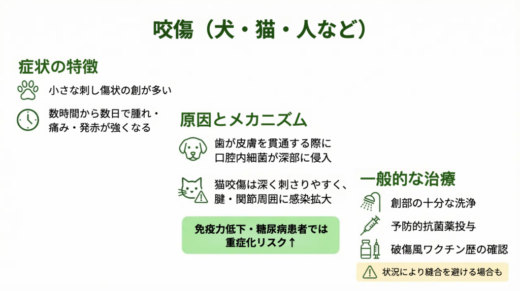 ※咬傷は小さな傷でも深部に細菌が入りやすく、数時間〜数日で腫れ・痛みが強くなることがあります。