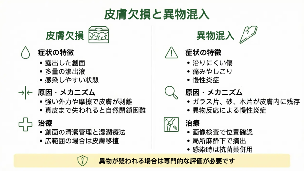 外傷のあとに「なかなか治らない」「押すとチクチクする」「しこりが残る」といった症状が続く場合、傷の中に異物が残っている可能性があります。異物が疑われる場合は、自己判断で放置せず、専門的な評価が必要です。