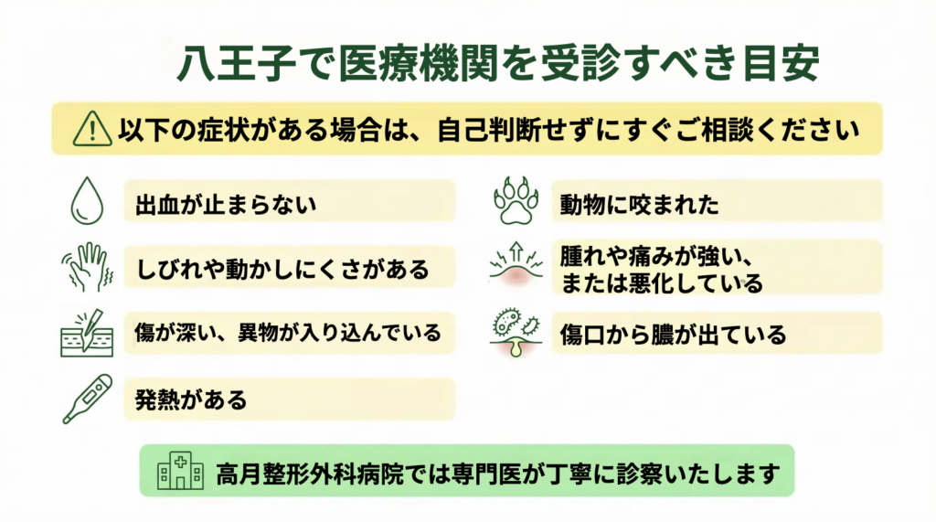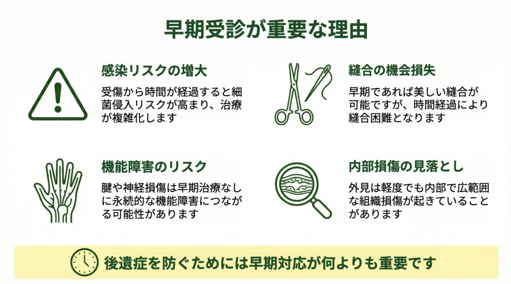 腱や神経の損傷、感染の進行、血流障害などは、対応が遅れるほど治療が複雑化し、機能障害や治癒遅延につながる可能性があります。八王子でケガをした際に早めに評価を受けることは、結果として治療期間や後遺症リスクを抑えることにつながります。