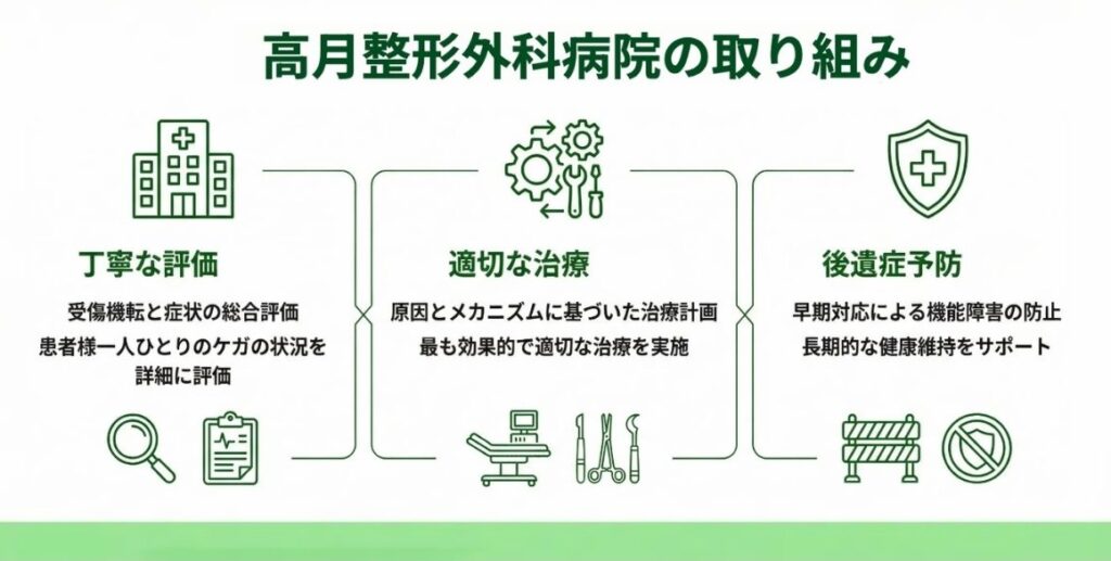 高月整形外科病院では、受傷直後の状態を的確に評価し、必要な処置につなげることを重視しています。傷の治りだけでなく、将来の機能や傷あとまで見据える点で、形成外科的視点も重要になります。