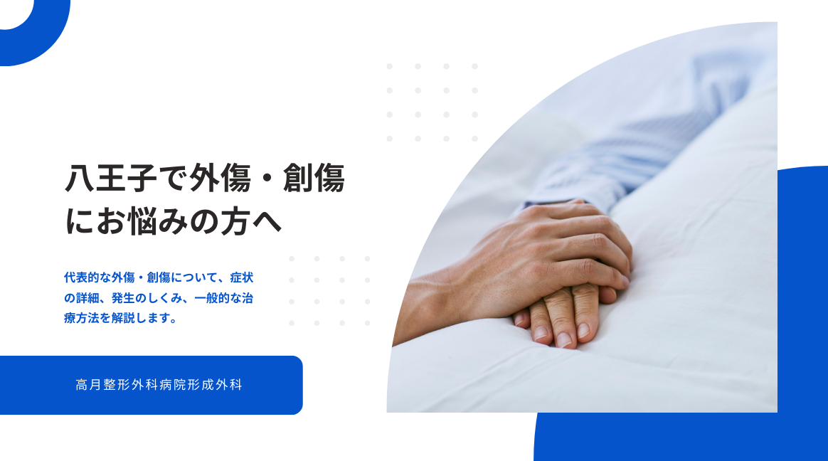 外傷・創傷は、同じ「切り傷」「擦り傷」に見えても、受傷機転や深部損傷の有無、感染リスクによって必要な治療が大きく変わります。高月整形外科病院では、八王子でケガにお悩みの方が安心して治療を受けられるよう、初期評価から治療、経過フォローまでを一貫して丁寧に行い、形成外科的な視点も踏まえて対応しています。