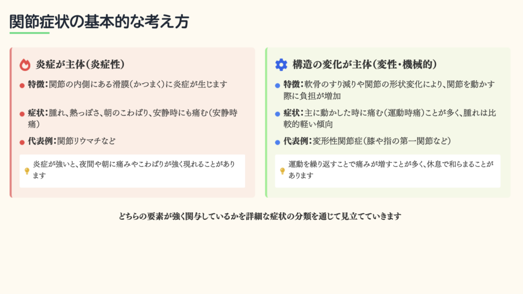 関節の症状は、炎症性と変性・機械的がはっきり分かれるとは限らず、両方の要素が重なっていることもあります。