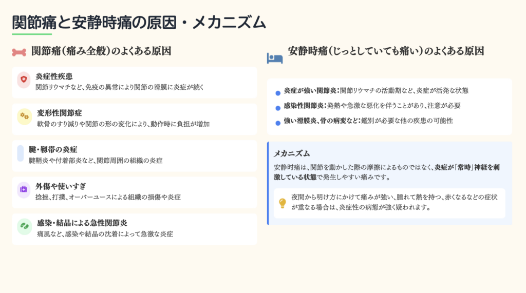 ここでは、特に重要な「関節痛(痛み全般)」と「安静時痛(じっとしていても痛い)」について、原因と体の中で起きているメカニズムを解説します。
