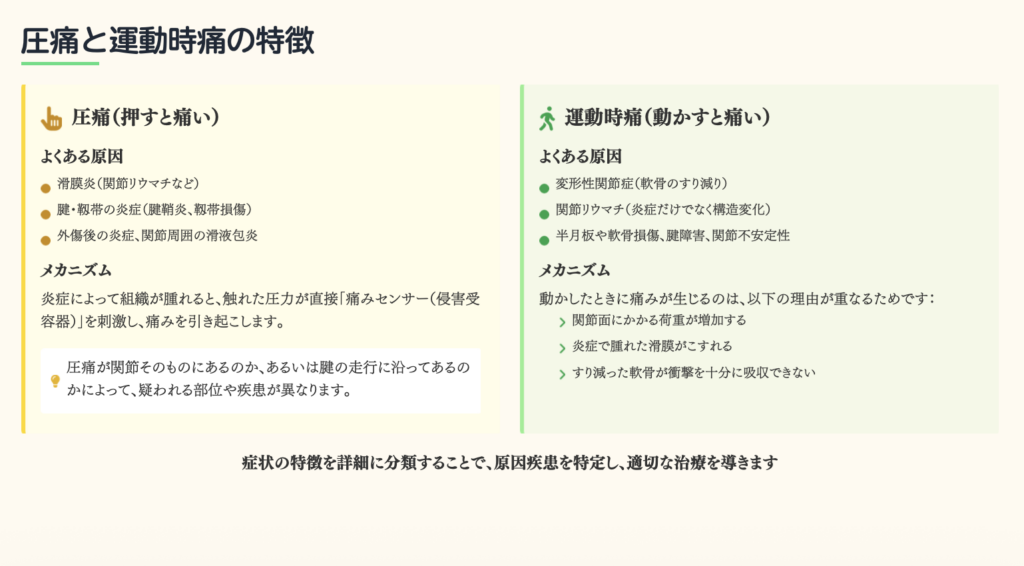 ここでは、診察でも重要な手がかりとなる「圧痛(押すと痛い)」と「運動時痛(動かすと痛い)」について解説します。