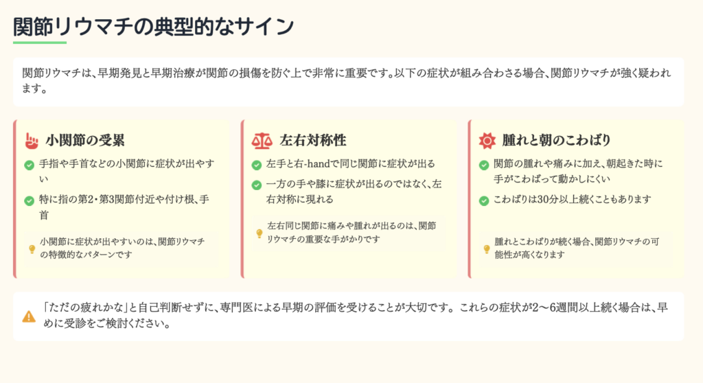 そして何より、関節リウマチは早期発見と早期治療が鍵になります。早い段階で適切に治療を始めることで、将来の関節の負担を減らせる可能性が高まります。