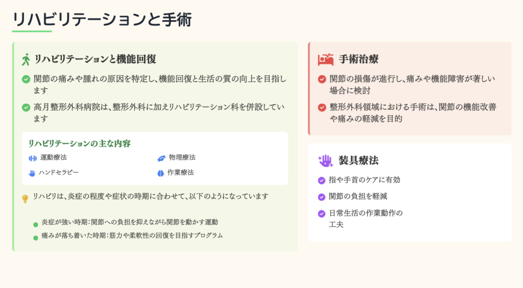 関節の痛みや腫れが続く場合、治療は薬だけで完結するとは限りません。原因を見極めたうえで、関節の機能を守り、日常生活を少しでも楽にするために、リハビリテーションや装具療法を組み合わせることが大切です。症状が進行している場合には、手術治療が検討されることもあります。