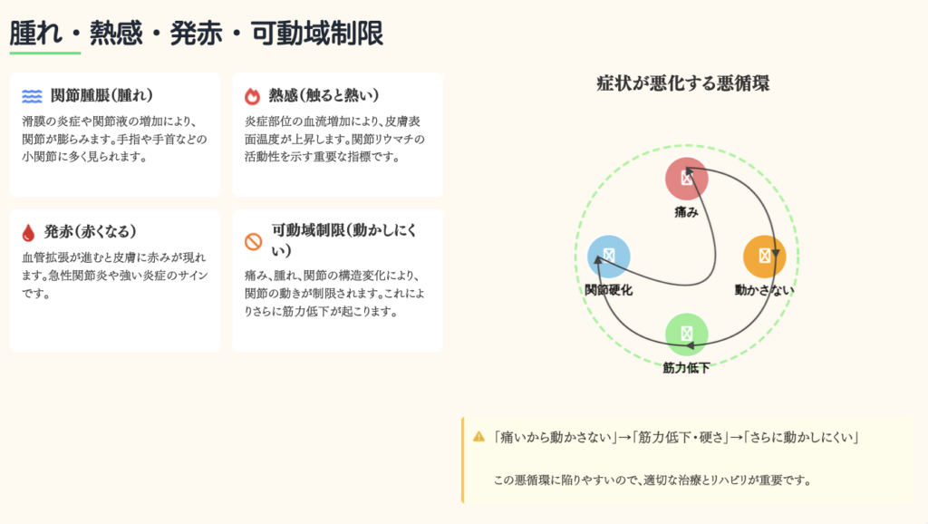 この炎症が慢性的に続くことで、関節の腫れや痛みが生じます。