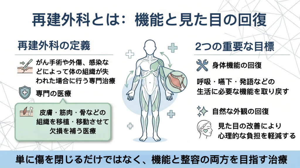 再建外科とは、がん手術や外傷、感染などによって失われた皮膚・筋肉・骨などの組織欠損を医学的に補い、身体機能と整容(見た目)の両方を回復することを目的とした医療分野です。