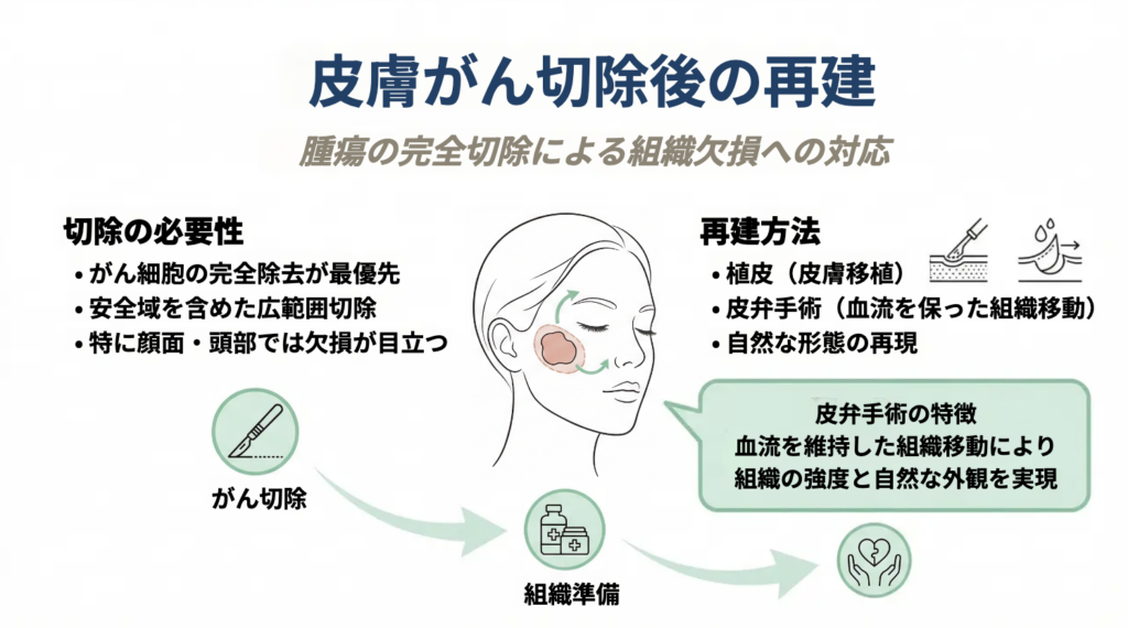 皮膚がんの治療では、最も重要なのはがん細胞を確実に取り除くことです。そのため、腫瘍そのものだけでなく、再発を防ぐ目的で周囲の正常組織を含めて切除する必要があります。こうした治療によって、皮膚や皮下組織の一部が失われることがあり、その結果として組織欠損が生じる場合があります。