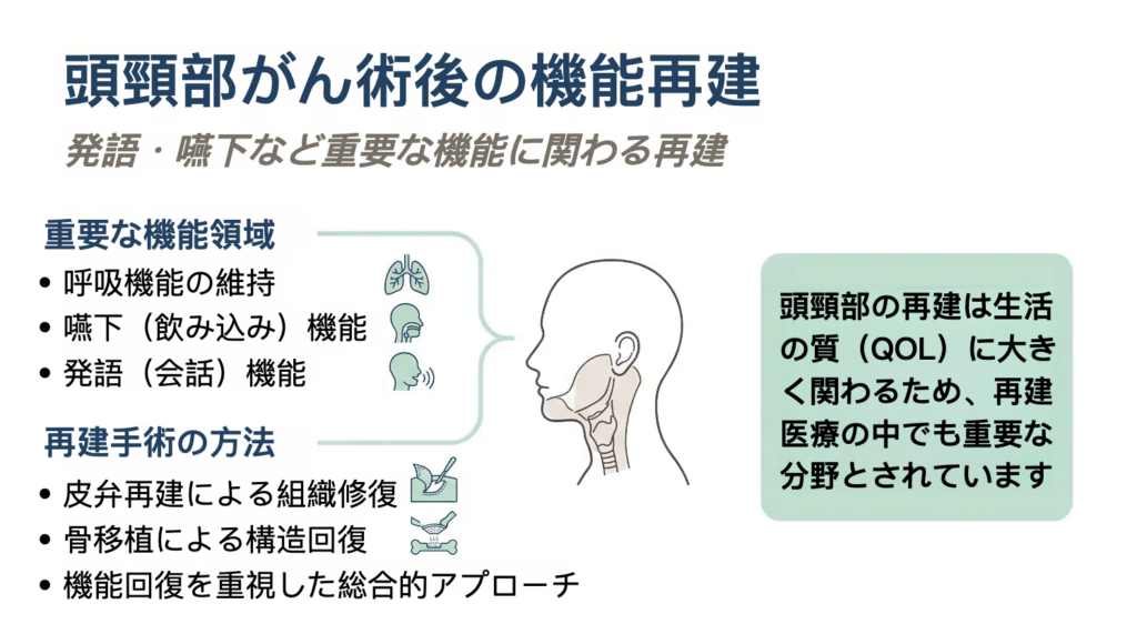 たとえば頭頸部の手術では、嚥下機能や発語機能が術後の生活の質に大きく影響することが知られています。再建方法の選択や手術範囲は、こうした機能の回復を考慮して決定されることがあります。