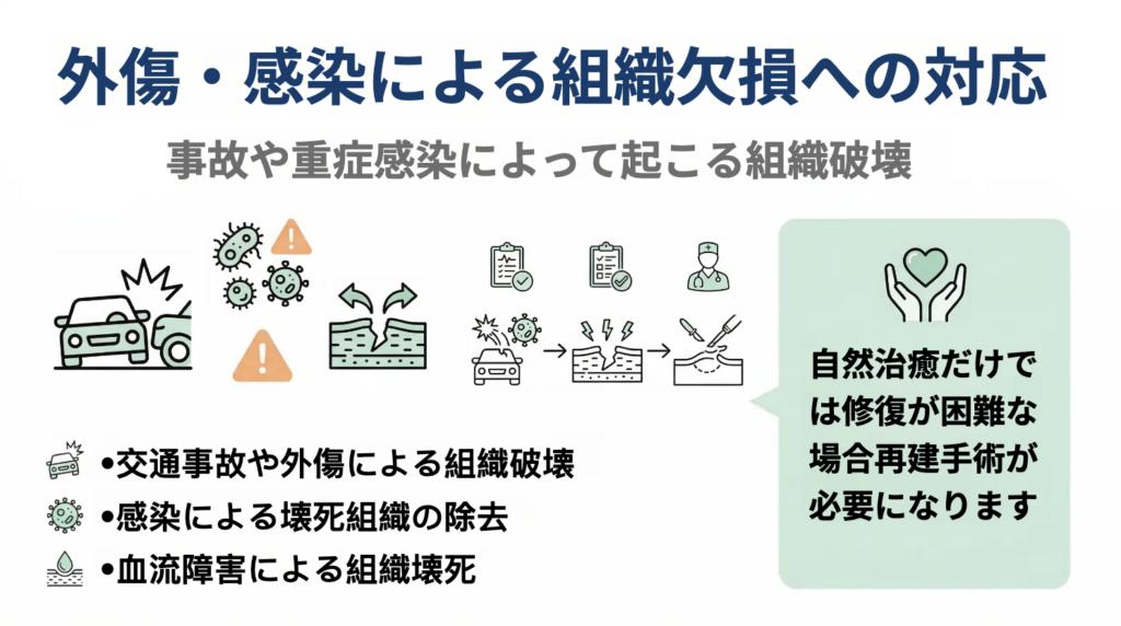 そのため、次のような理由で皮膚や軟部組織の欠損が生じることがあります。