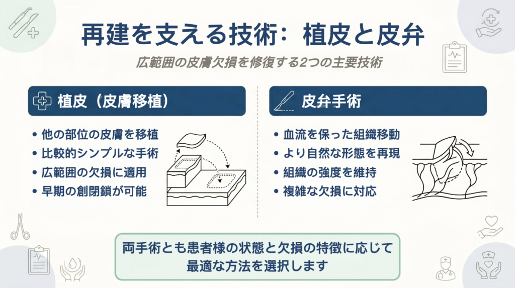 外傷、がん手術、感染などによって皮膚や軟部組織が失われた場合、欠損した部分を医学的に補う必要があります。その際に中心となるのが、植皮(皮膚移植)と皮弁手術という2つの再建技術です。