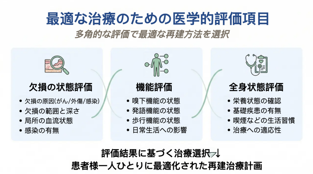 再建外科治療では、欠損の原因や範囲、機能への影響、全身状態などを総合的に評価することが重要です。