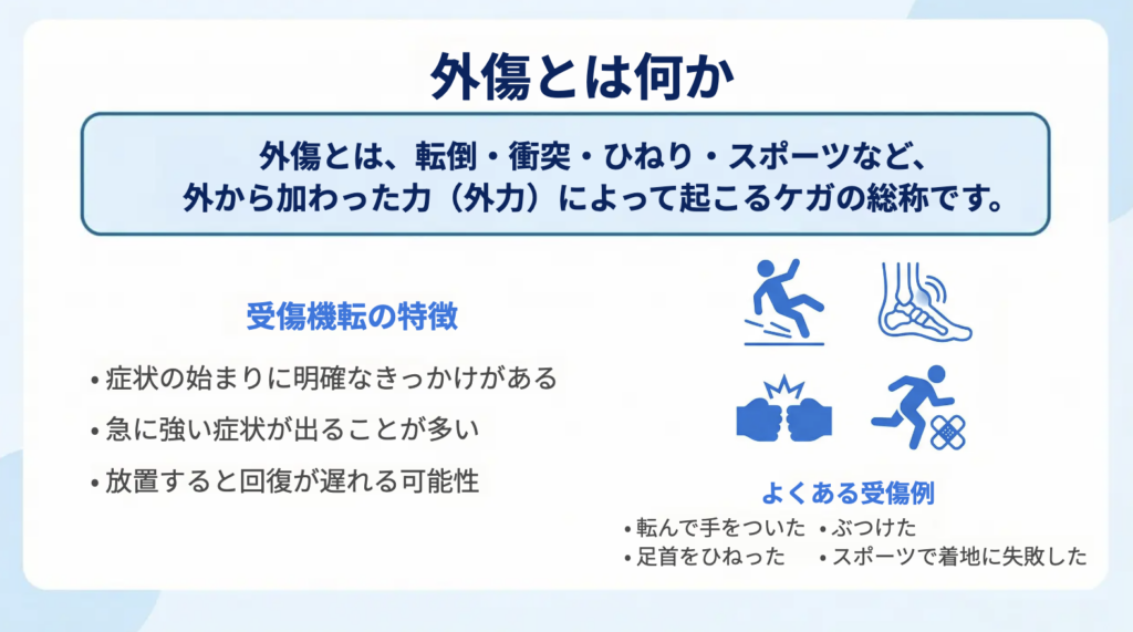 本記事では、外傷でよくみられる症状を整理し、それぞれの原因とメカニズム、整形外科での一般的な治療の考え方を、できるだけわかりやすく解説します。